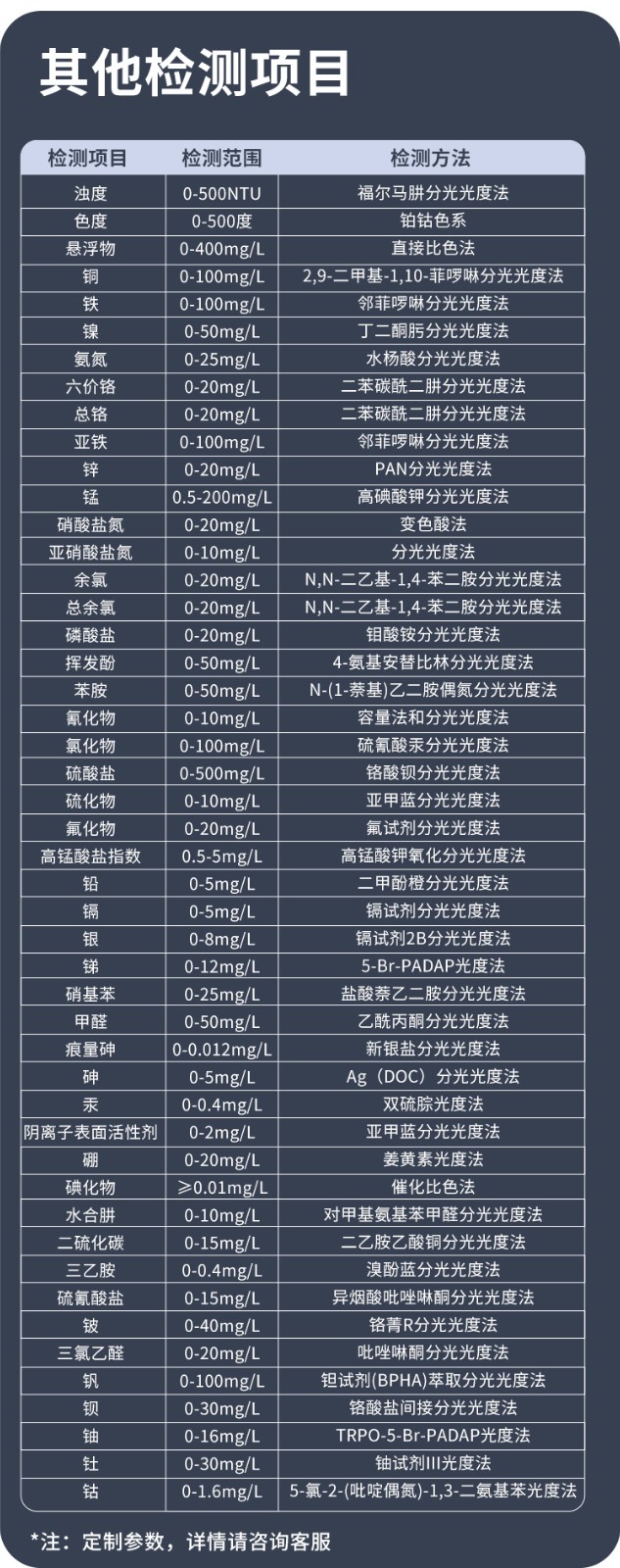 The principle of the testing project conforms to the recognized methods in the environmental protection industry. The color comparison method adopts tube color comparison, with a built-in micro thermal printer. After the detection is completed, the data can be printed, and the test data can be exported through a USB flash drive. The equipment is equipped with the Genesite water quality intelligent detection system, making detection simple and intelligent.