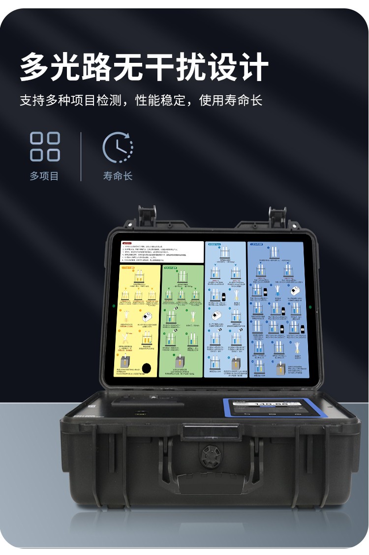 The principle of the testing project conforms to the recognized methods in the environmental protection industry. The color comparison method adopts tube color comparison, with a built-in micro thermal printer. After the detection is completed, the data can be printed, and the test data can be exported through a USB flash drive. The equipment is equipped with the Genesite water quality intelligent detection system, making detection simple and intelligent.